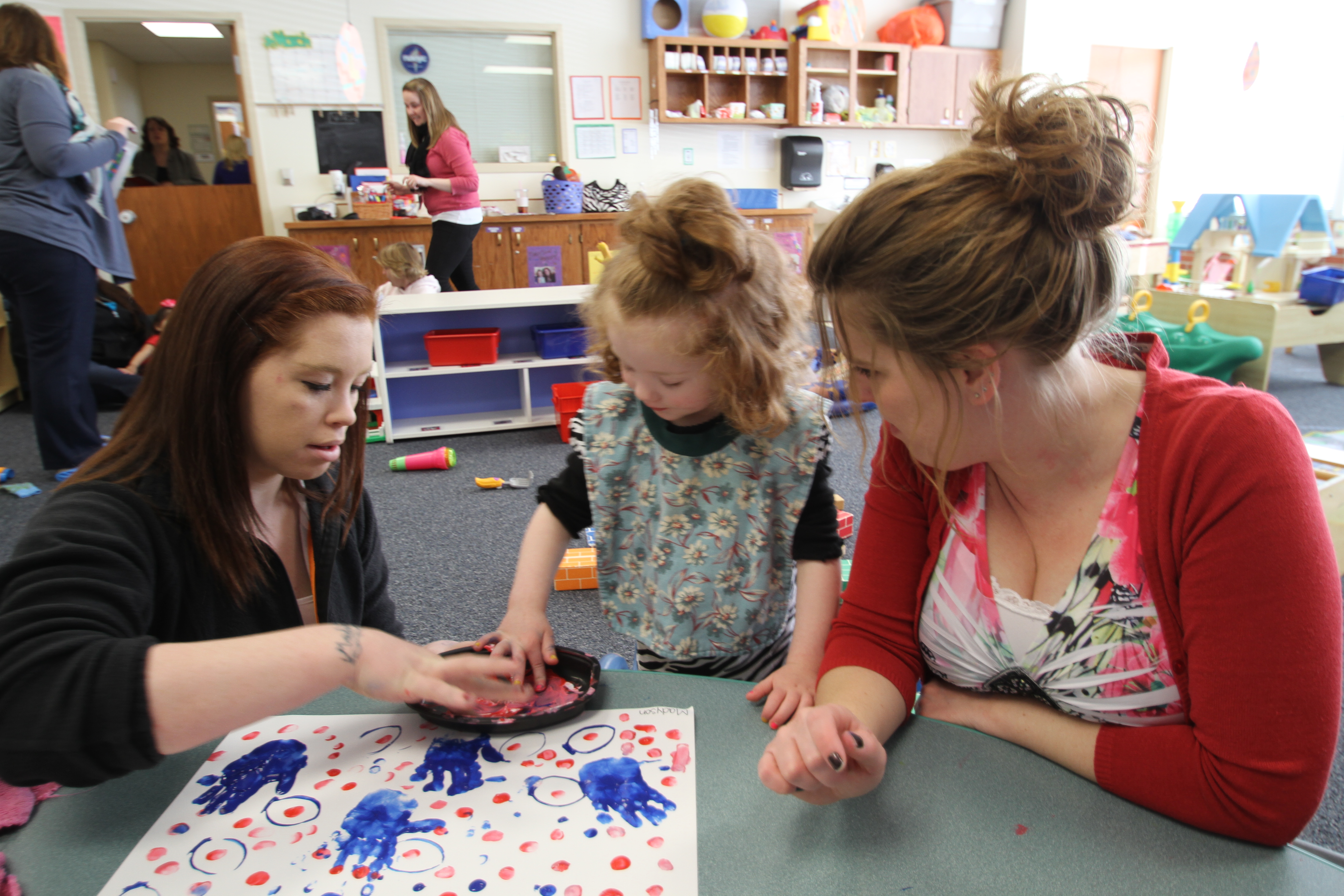 Payton showing Maddie how to finger paint, while one of the center’s para-educator supports the interaction