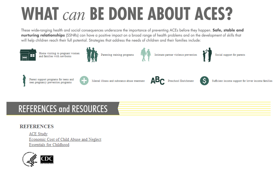 […] Prevent Adverse Childhood Experiences – Infuse families and communities with the protective factors they need to ensure that the adverse childhood experiences that can derail social-emotional development don’t happen. And when ACEs do occur, we must provide immediate support to mitigate the toxic stress that can result. We can all do this. In schools, we can provide to support to families we see struggling. We can reach out to our neighbors and act as informal support to those who need help. We can support home visitation and early learning programs that are proven to get results. […]
