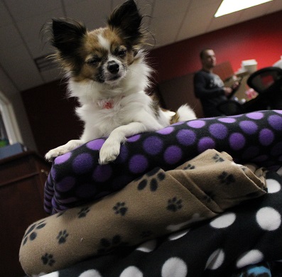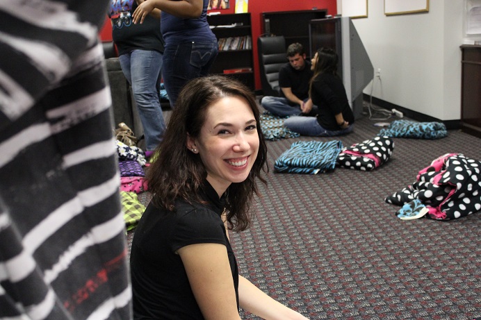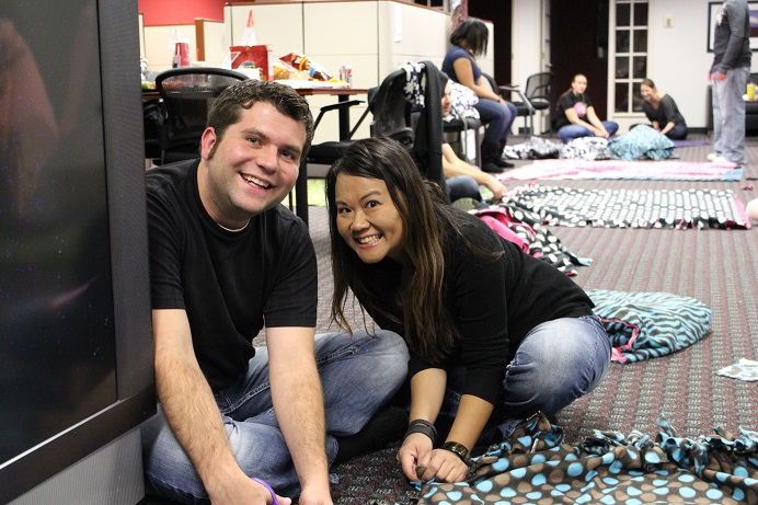 So this year, Project Everlast Omaha hosted a blanket party! We had counselors, employees, young adults, volunteers and one enthusiastic dog join us for an evening of cutting and tying cheery fleece blankets for next year’s campers.