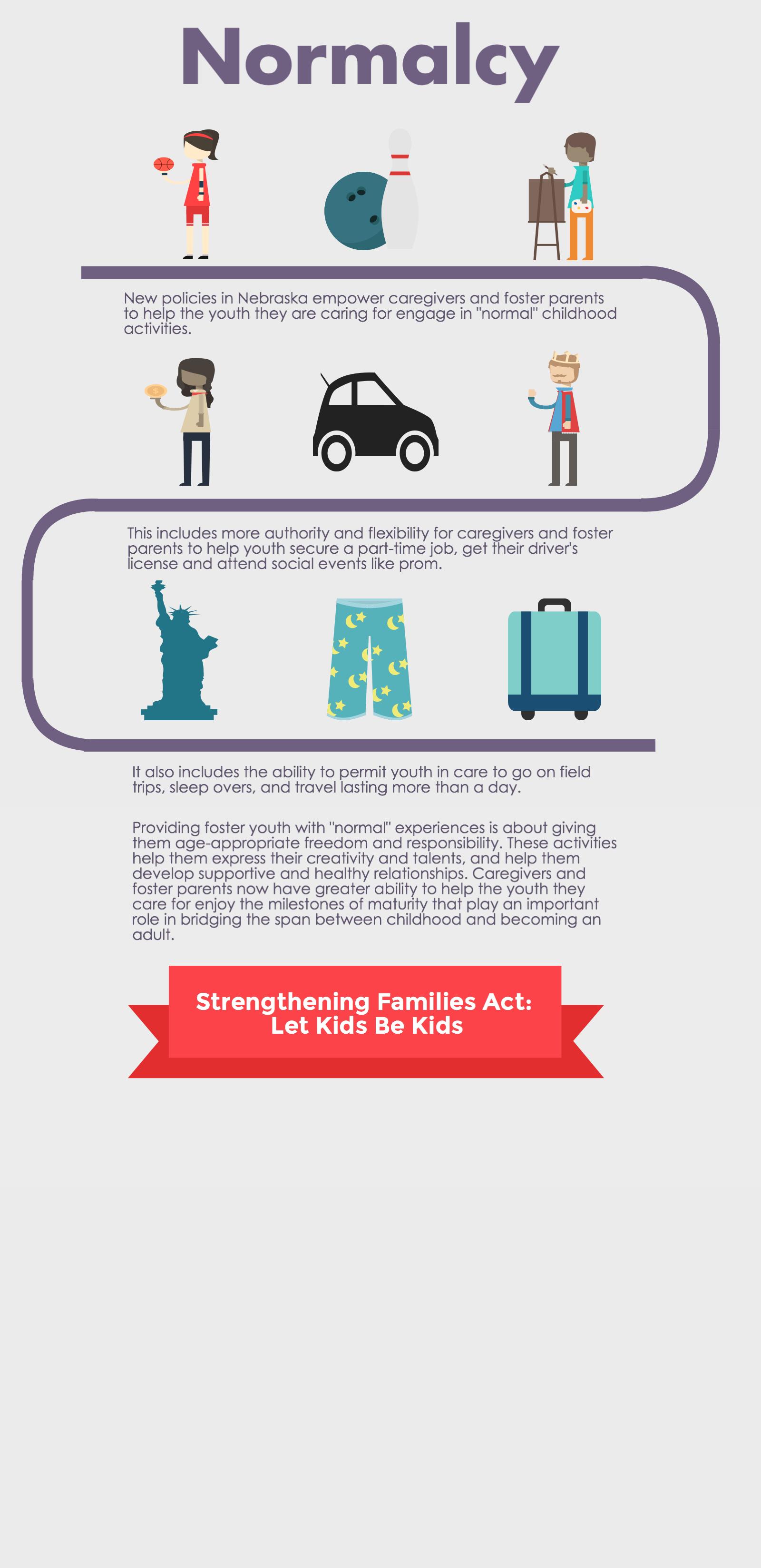 Nebraska policymakers are currently discussing how to implement the Strengthening Families Act (SFA) in our state. While there are many parts to this important legislation, what we believe will be most critical to system-served youth are the components that relate to “normalcy.”