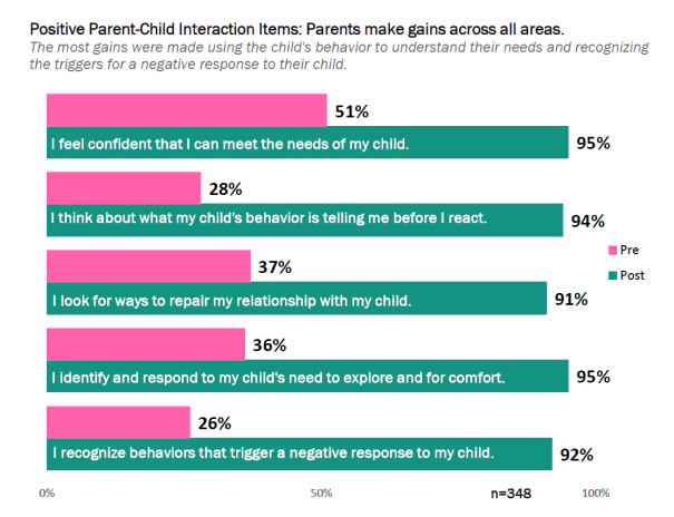 The report commissioned by Nebraska Children used data from a 9-question survey given to participants that asks them to assess their parenting stress, their parent-child relationship, and their parenting skills. Additionally, facilitators completed a survey describing session logistics and providing feedback on the sessions and their own reflective consultations. A total of 358 participants completed the evaluation surveys from 58 COS-P classes held across the state, and the results were very encouraging.