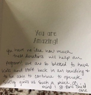 Sara Colford, the Student Services Facilitator at Columbus Public Schools, personally contacted most of the area’s home and center providers to find out which items they needed. She and Heidi Luebbe, Columbus Public Schools’ social worker, then wrote “thank you” cards to the local providers and enclosed a $10 gift certificate to the Broken Mug. Sara and Heidi managed to purchase a total of 225 gift certificates for their home and center providers.