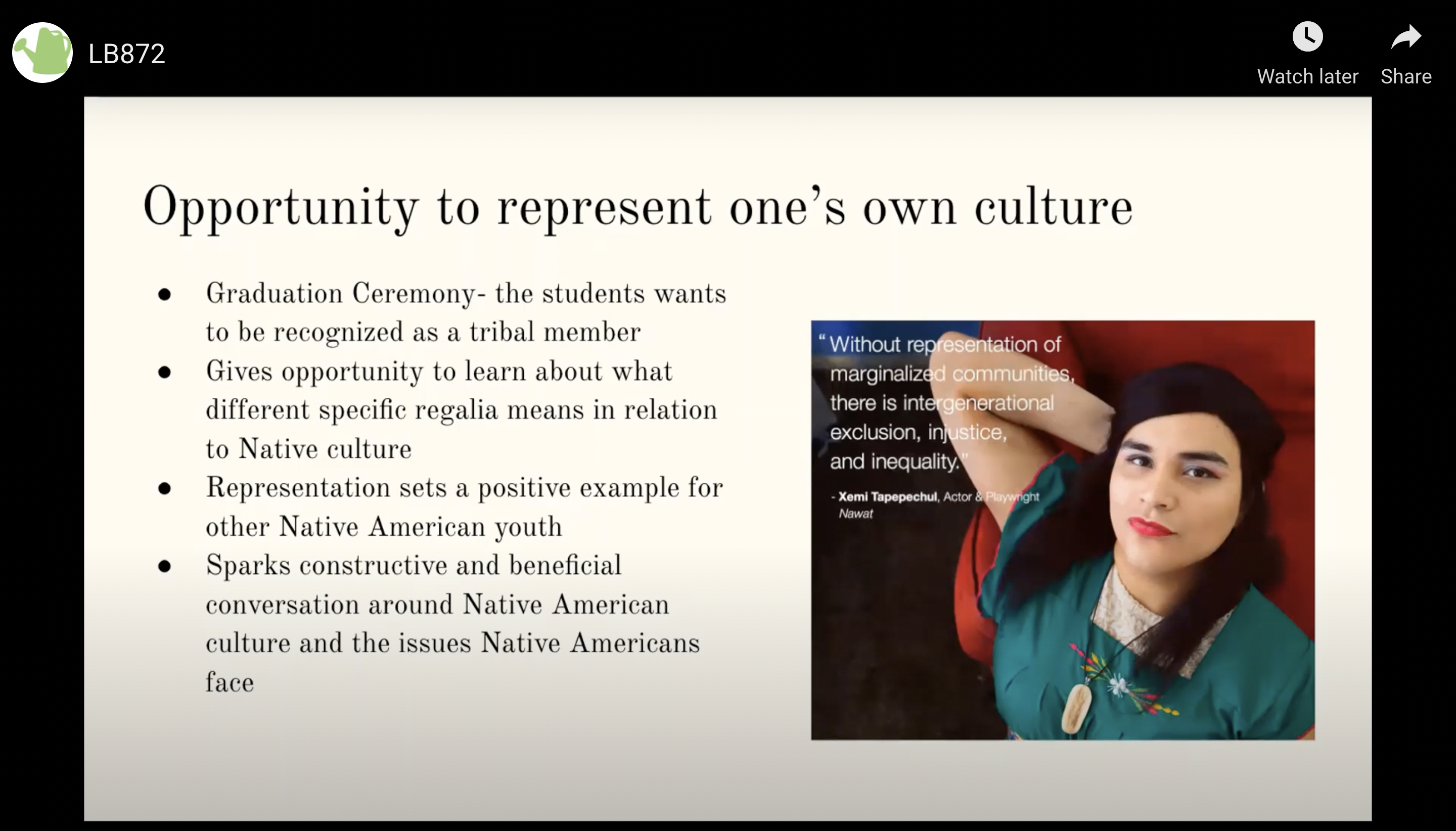 The groups also presented on LB872, which authorizes the wearing of tribal regalia for certain students, including those of Native American heritage. Maykayla Ridgebear expressed pride about her heritage and her frustration when her high school principal refused to allow her to wear a beaded mortarboard, while some of her peers had violated the formal dress code with no disciplinary repercussions.