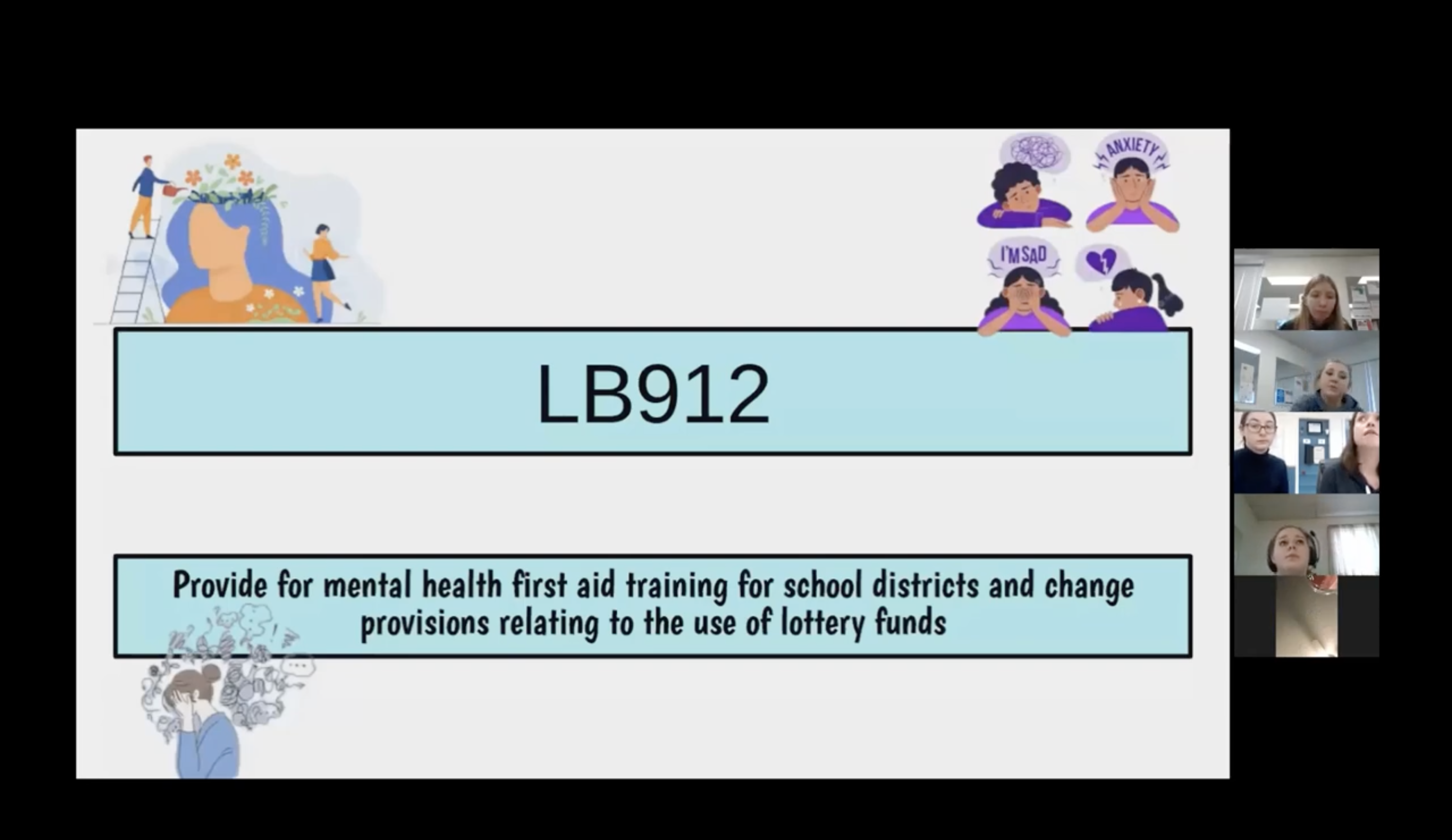 Young leaders also presented LB912, which proposes that lottery funds may be used toward school districts and change provisions to undergo mental health first aid training. The young leaders agreed that teachers ought to become versed in escalation techniques with students grappling with mental health issues.