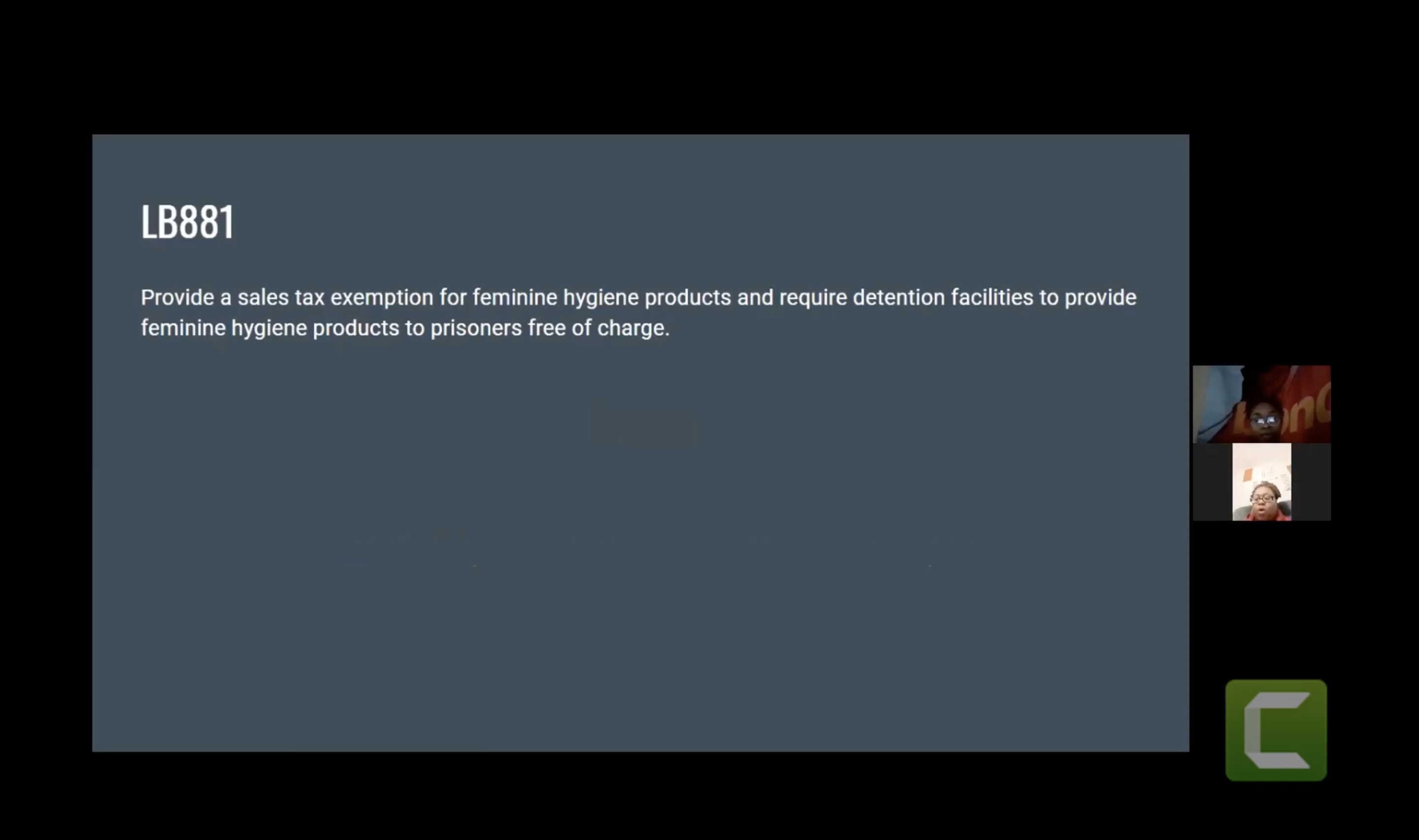 Another team of young advocates shared support of LB881, which proposes a sales tax exemption for feminine hygiene products, along with a mandate for detention centers to provide free feminine products to prisoners. The group delivered some compelling points, including findings that female prisoners were at higher risk of being shamed or sexually abused by guards in exchange for these essential items.