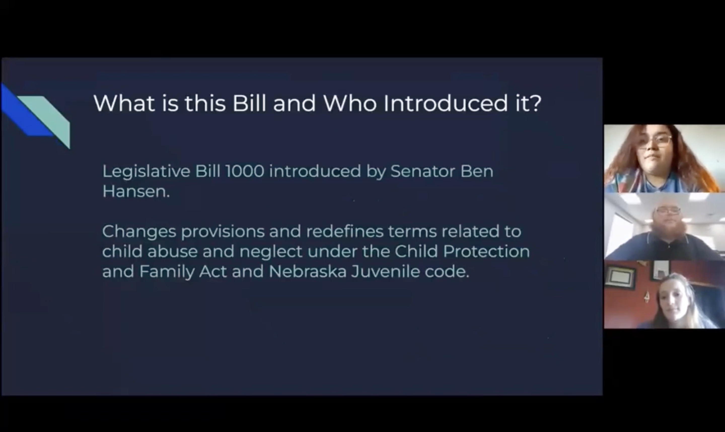 Finally, a group represented LB1000, which seeks to alter child abuse and neglect-related provisions and terms under the Child Protection and Family Safety Act and the Nebraska Juvenile Code.