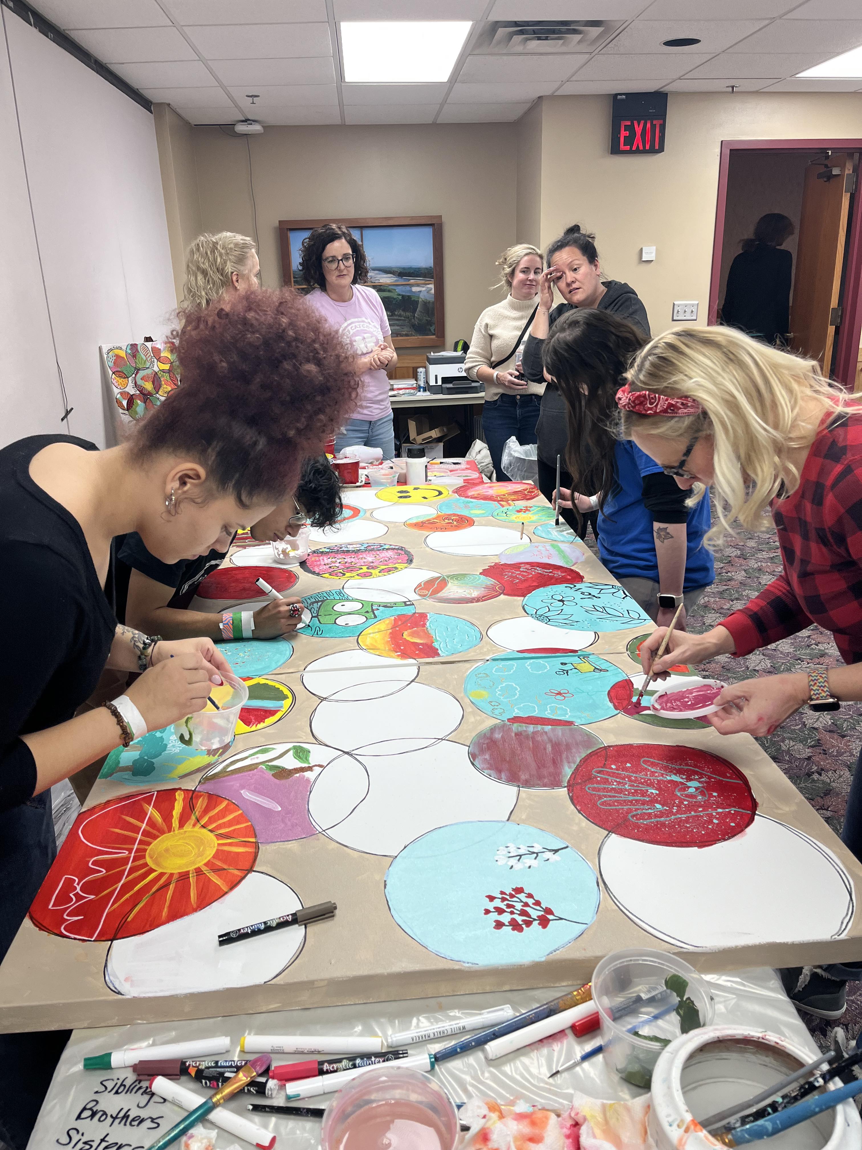 The painting rests against a table after a full day of connection and creativity. Three distinct panels collectively made by more than 30 artists from Camp Catch-Up’s inaugural Winter Camp. Each circle within the panels reflects the memories of the artist’s time at Camp Catch-Up.