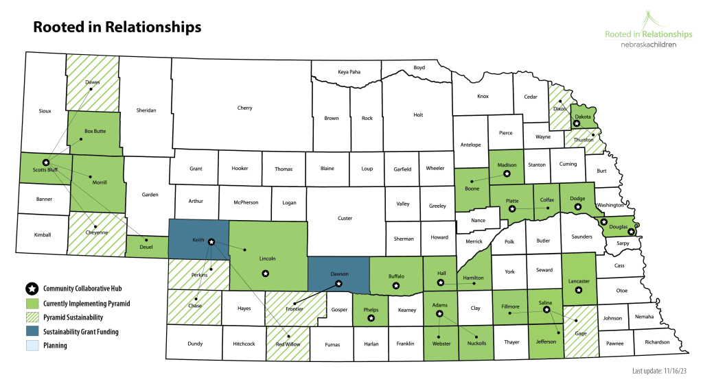 The success of the program has led to growth. In the end of the first year, Brehm, who had been working alone, said she hired a part-time professional to work alongside her. In the second year, additional funding from the state’s early childhood mental health allocation Nurturing Healthy Behaviors allowed Rooted to hire a second part-time staff member and add three more counties. The initiative, which employs a hub-and-spoke approach, now has 16 county hubs that provide outreach to 33 communities in Nebraska and seven Rooted in Relationships staff.