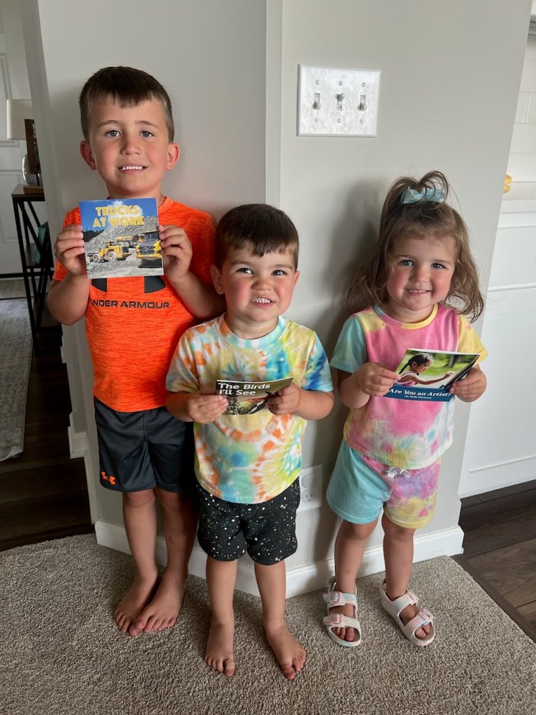 Like the children at Nae’s Home Away from Home, Mason is excited to receive his books at his house as well. Sara says that he wants to stop at the mailbox every day on the way home to see if books have come. “When he gets them,” she says, “he opens them up and adds them to his collection of books (NGR) in his room.” Sara says he will share with his younger twin brother and sister, but “he’s very protective of his books.” She tells how he takes the books all over the house in a box he keeps them in because he is so proud of them. “He likes to sit and look through the pages and make up stories with them,” she says.