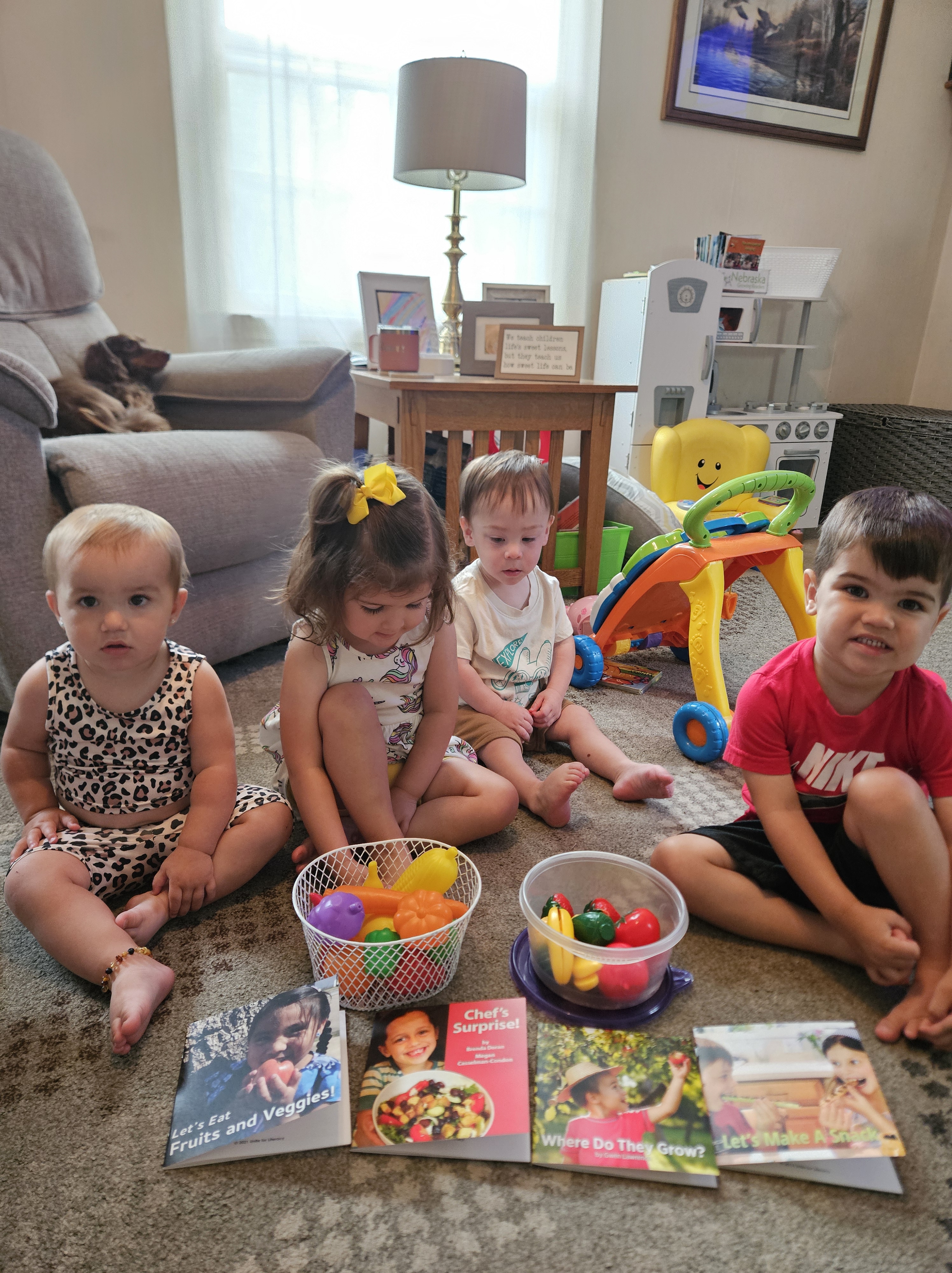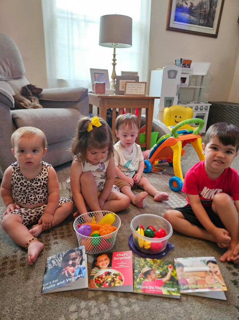 At Nae’s Home Away from Home, her children love to make the NGR books part of their daily play. Norenberg describes the library game they play where she must be the librarian who scans their books when they bring them to her. She also likes to make the books part of the activities she includes in her daily schedule. “Every day there’s a national something day,” she says. Recently, it was Eat Your Vegetables Day, and Norenberg read the children NGR books like Count Your Veggies and The Fruit Market. To enhance the reading, she gathered the plastic fruits and vegetables she had in her play kitchen and had the children identify which were fruits and which were vegetables. She then had them sort by color and count the number of each color they had.