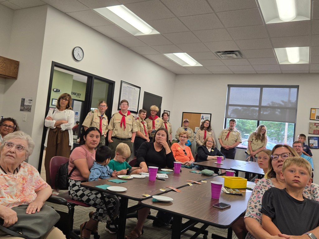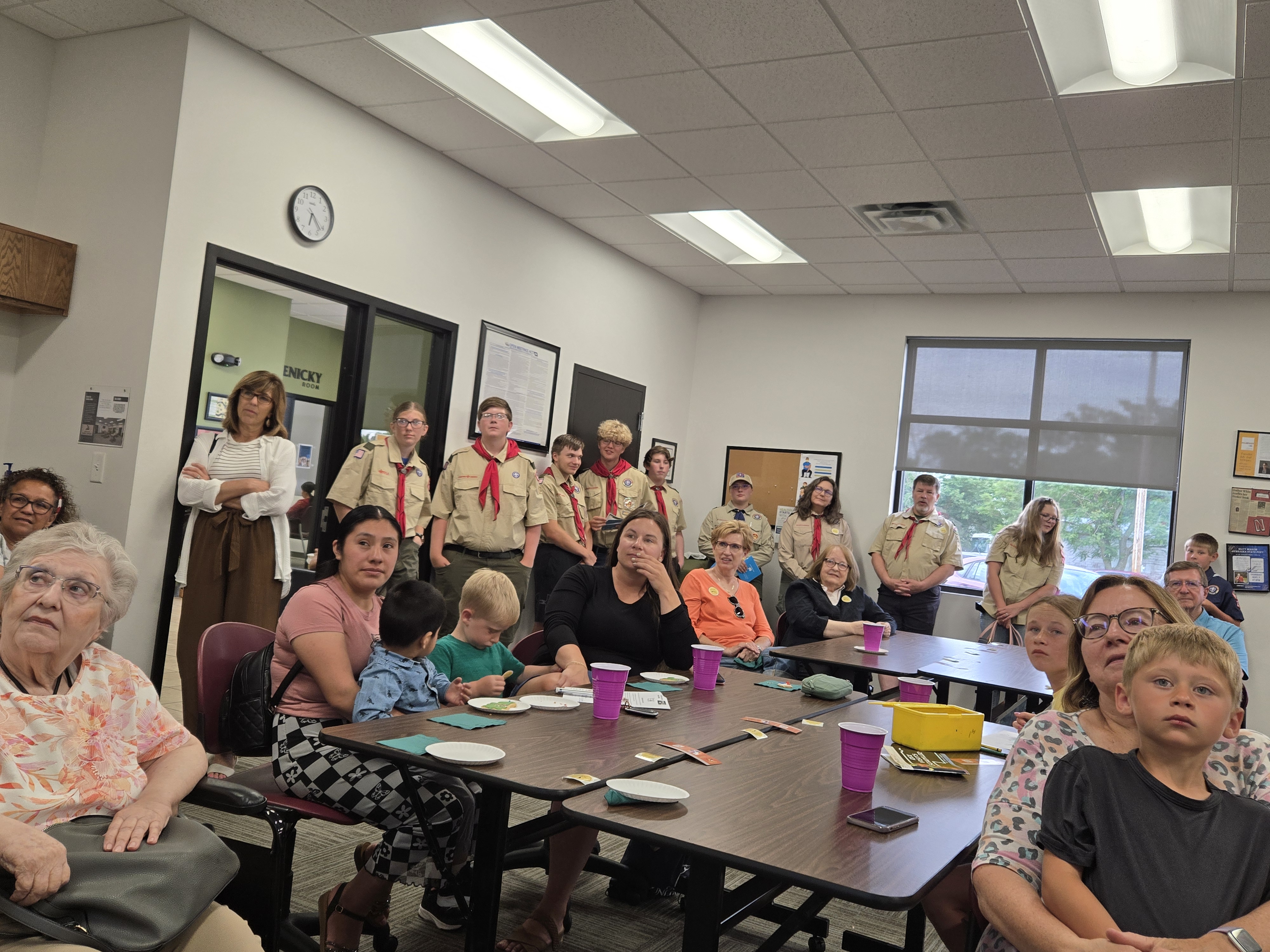 At the Schuyler Library, there are parents and children gathered around a table laid out with dinosaur and patriotic red, white, and blue cookies. There are doting grandparents, representatives of Nebraska Growing Readers (NGR), and the librarian. There is the local Scout troop. And, in the midst of it all, there is a 10-foot orange-brown T-Rex working the crowd.